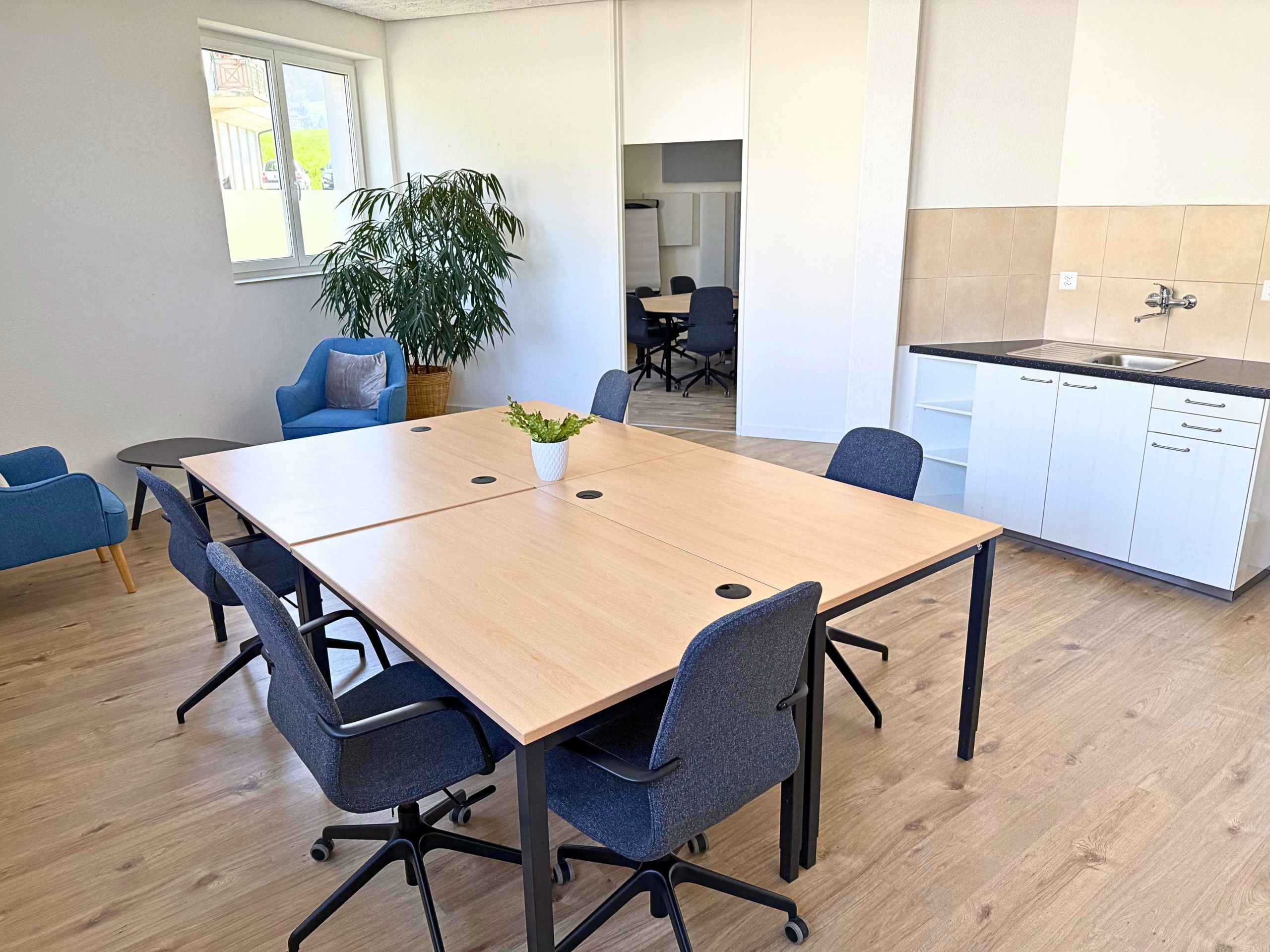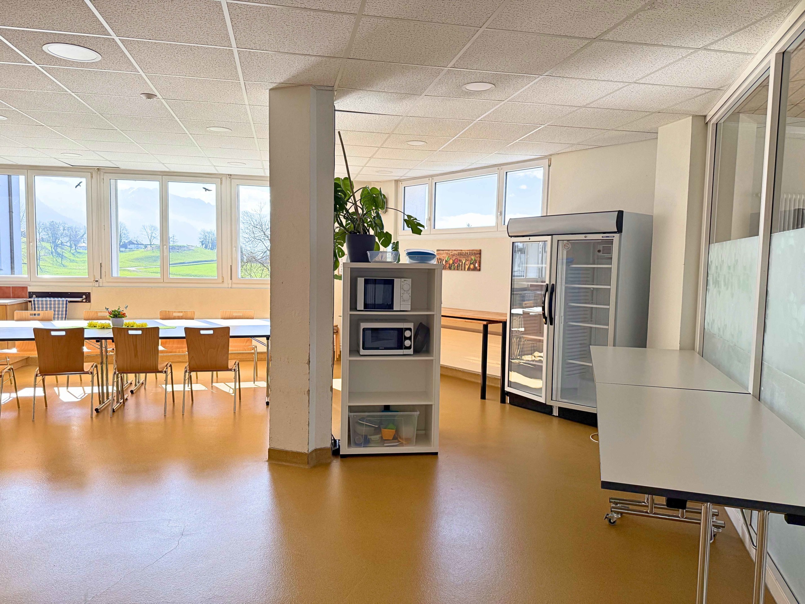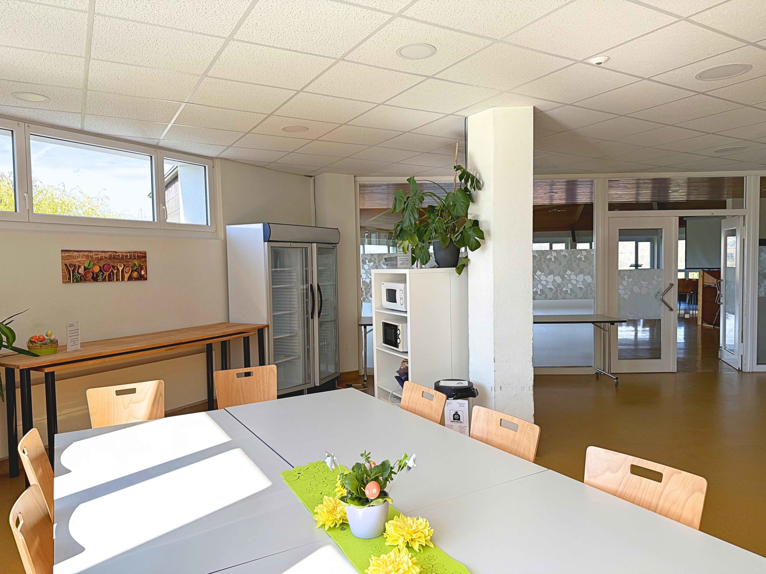 Salle du foyer attenante à la salle Dents-du-midi pour la préparation de vos apéritifs et repas comprenant une cuisine standard non équipée (sans matériels et ustensiles de cuisine).