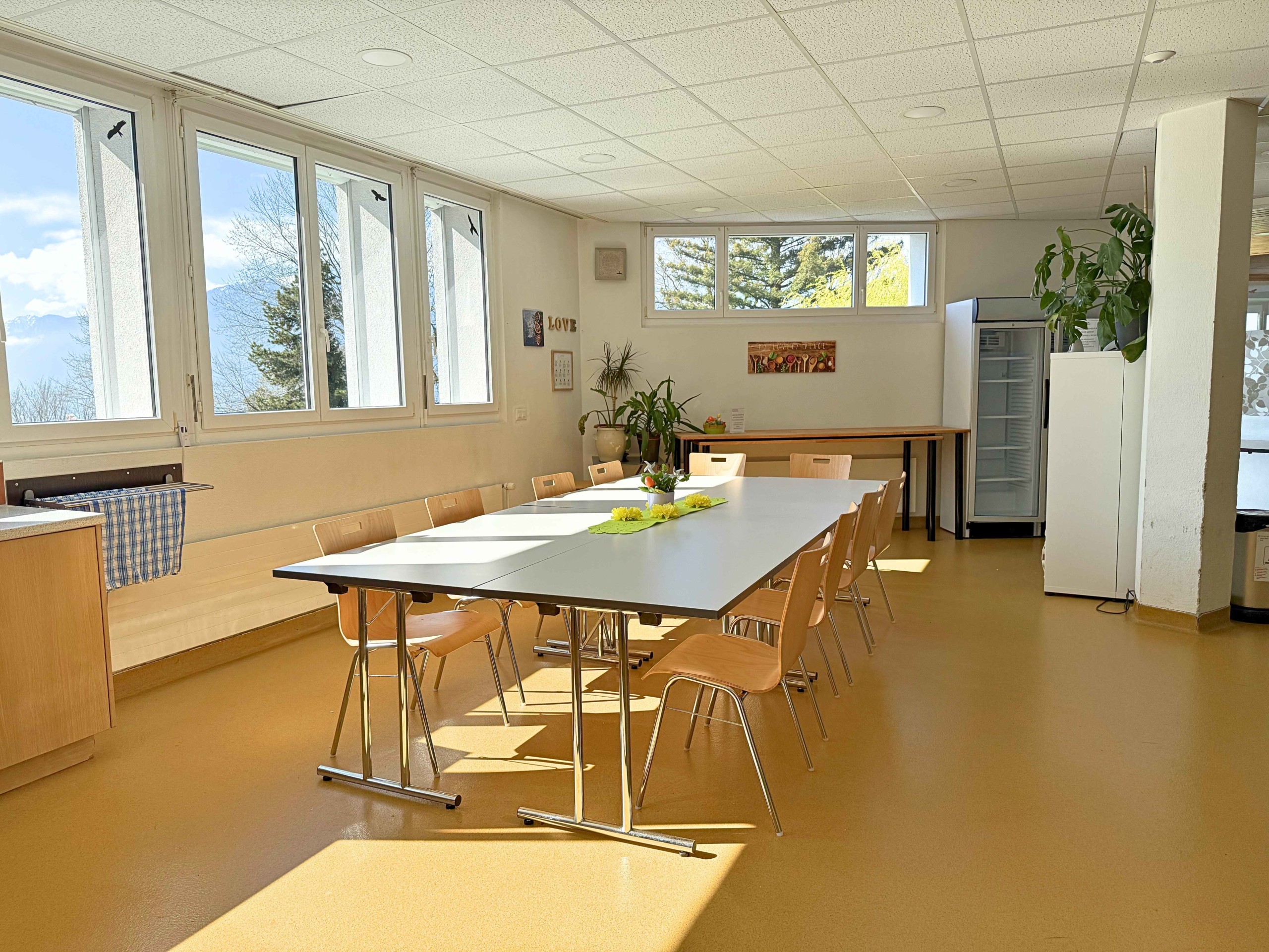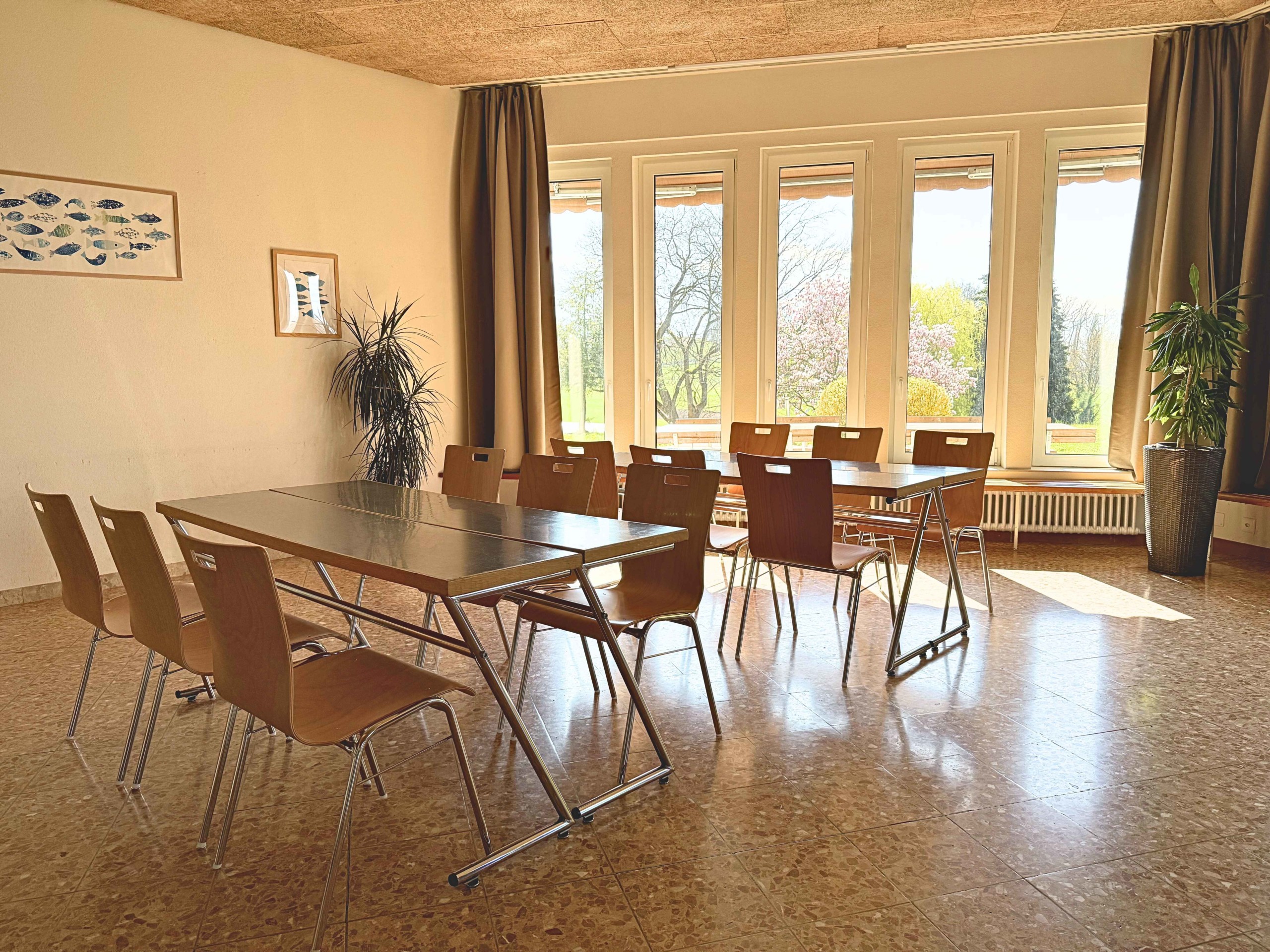 Grande salle donnant sur les jardins, avec vue sur le lac Léman et les Dents du Midi. Capacité d’accueil de 50 personnes pour salle de cours ou repas (avec chaises et tables). Et 80 personnes en salle de conférence (chaises uniquement) ou pour un apéritif debout.