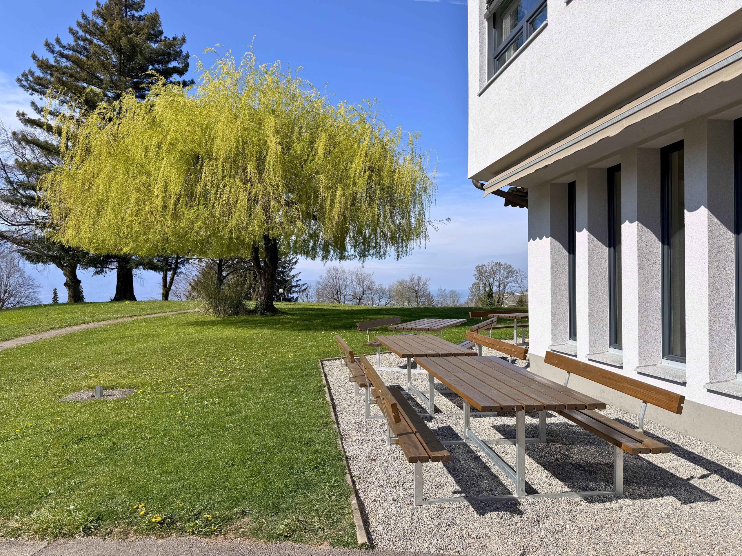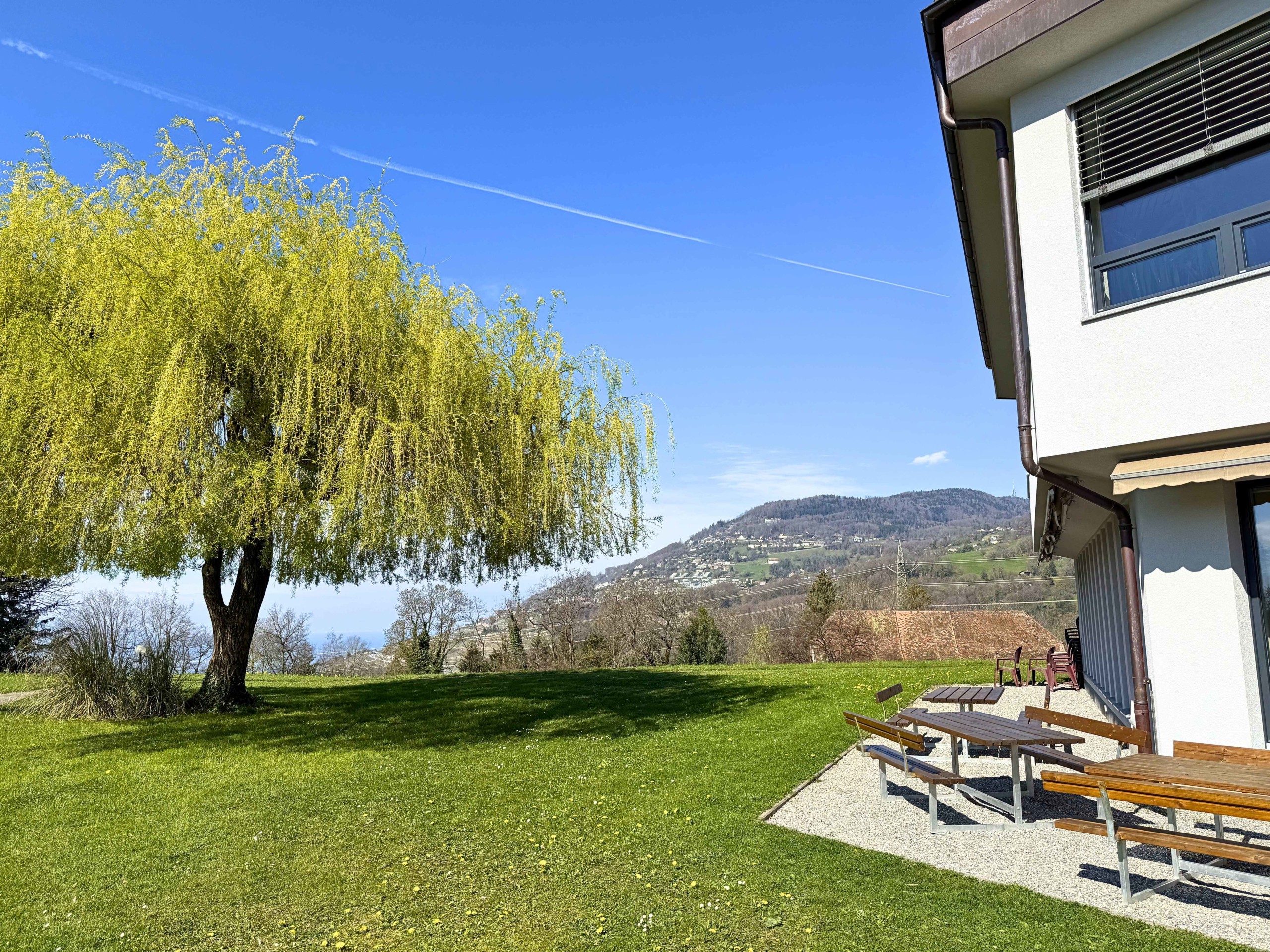 Grand jardin au pied de la salle Dents-du-Midi avec une magnifique vue sur le lac Léman. Idéal pour un repas autour d’un barbecue ou pour un apéritif de fête !